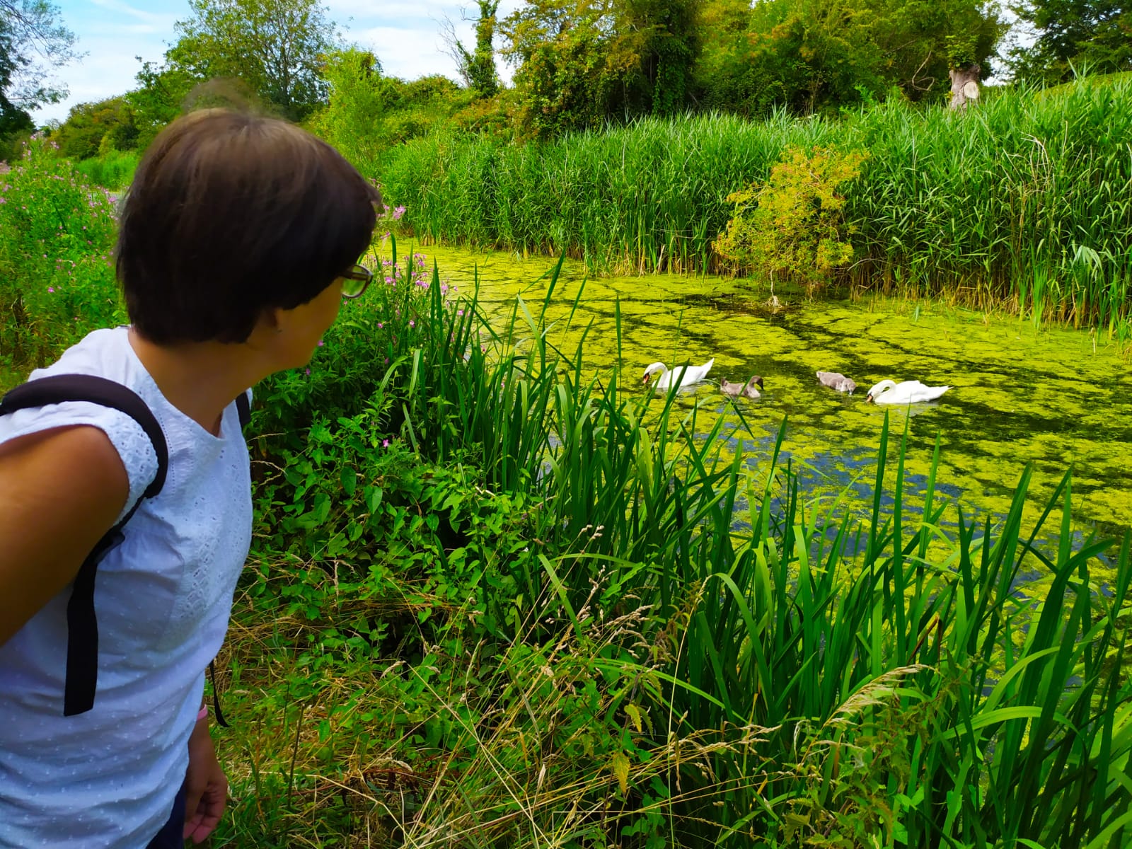 I l'ànec de bec roig, content, després de deixar-se acaronar les plomes per la petitona, va tornar al canal d'on no havia d'haver marxat mai.